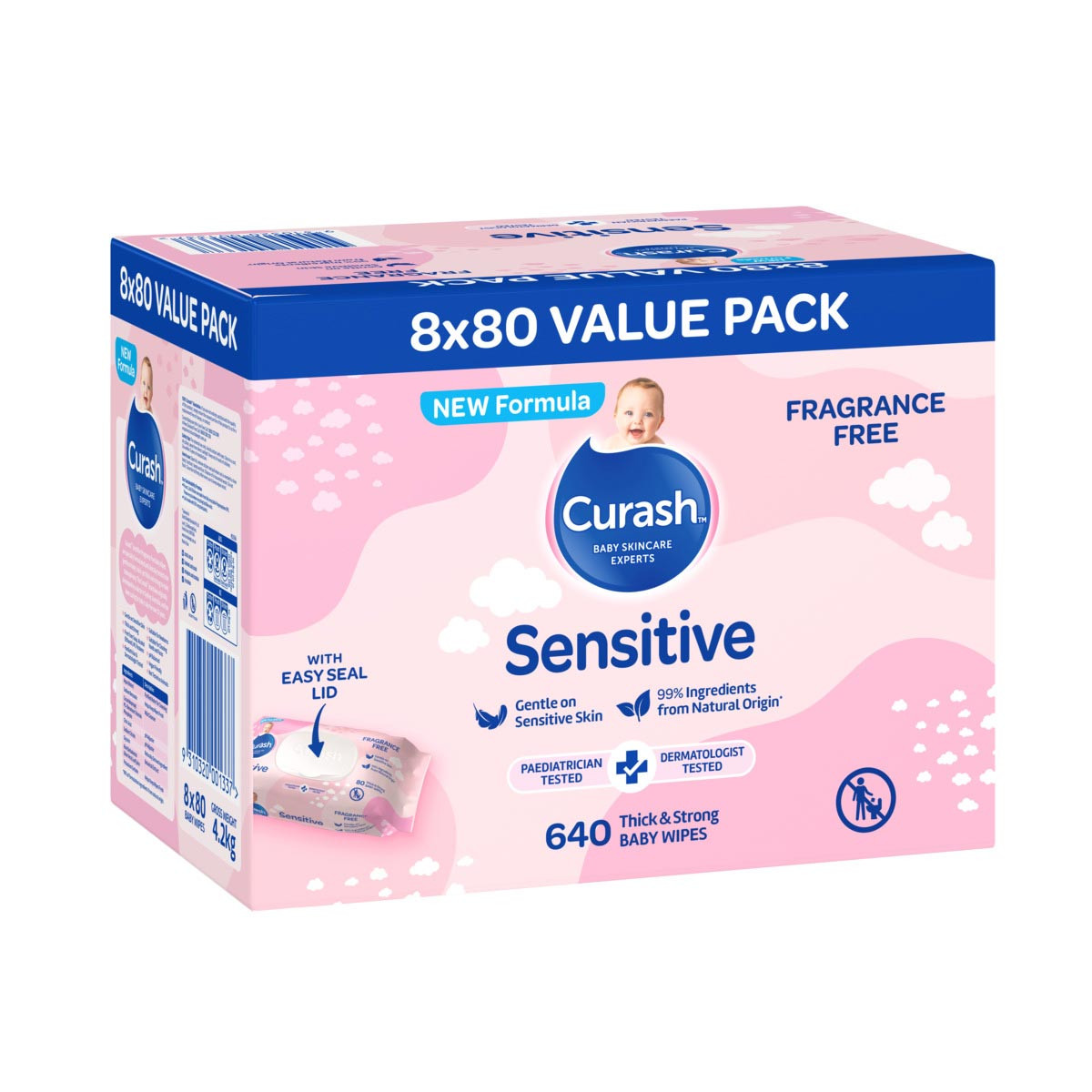 New Formula Curash Sensitive Fragrance Free Baby Wipes are specially formulated with 99% of the ingredients from natural origin. They are free from perfumes, soap, alcohol and preservatives such as parabens, MI or phenoxyethanol. Dermatologist and Paediatrician tested, they are pH balanced and suitable for sensitive skin. Curash Sensitive Fragrance Free Baby Wipes are soft and gentle for baby, but also thick and strong for you, so you can tackle whatever mess life throws at you. They are vegan friendly, not tested on animals and also suitable to clean little hands and faces. Our new packaging is made from fully recyclable polypropylene (PP) and the Easy Seal lid contains 30% recycled plastic. The Curash brand was originally developed by a doctor in Sydney, Australia, and has been caring for baby's skin for over 35 years.